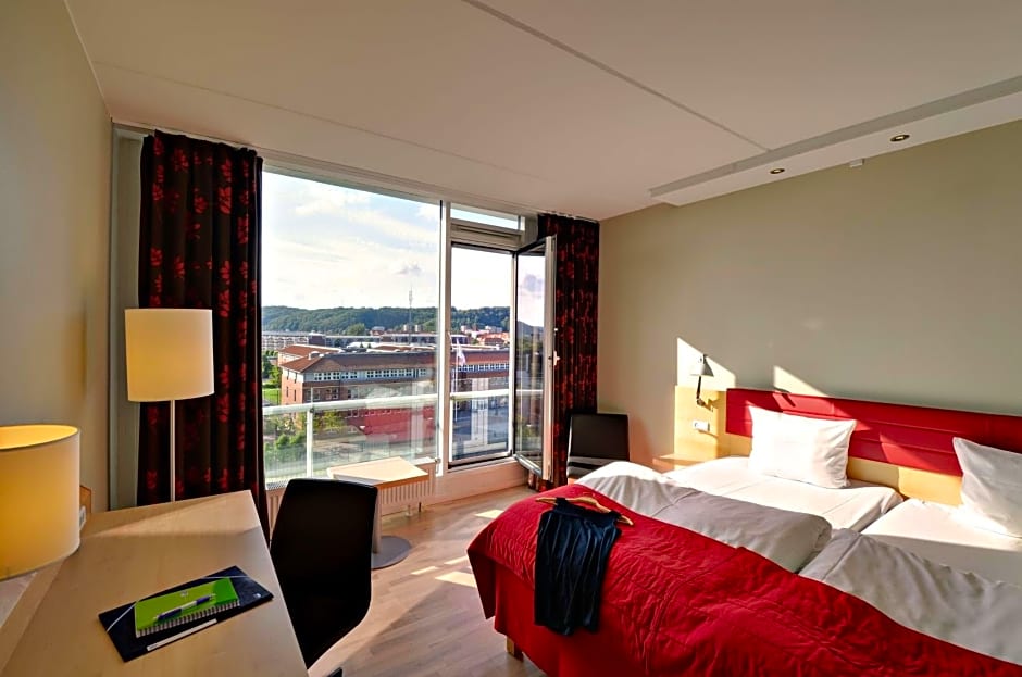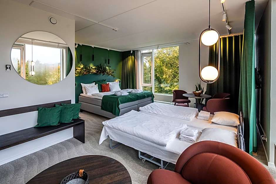 Spacious room with a leather sofa, coffee table, dining area and views of Vejle Bypark.